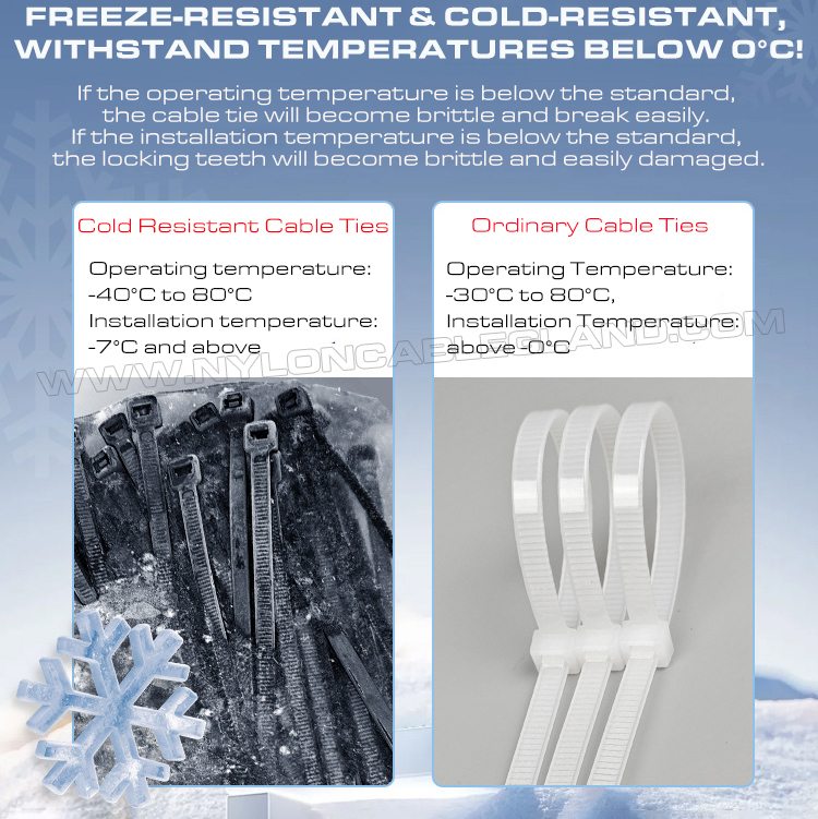 Kältebeständige Kabelbinder (auch als frostbeständige Kabelbinder bekannt) sind Nylon-Kabelbinder für kalte Umgebungen. Sie bestehen aus kältebeständigen Spezial-Nylonmaterialien (z. B. modifiziertem PA6.6). Zu ihren Vorteilen zählen eine hervorragende Kälteschockbeständigkeit (Widerstand gegen Sprödbruch), hohe Festigkeit, hohe Verschleißfestigkeit, gute Dimensionsstabilität sowie hervorragende chemische Beständigkeit und elektrische Eigenschaften. Sie behalten ihre Festigkeit, Zähigkeit und Sprödigkeit auch bei extrem niedrigen Temperaturen (z. B. -40 °C) – niedriger als Standard-Nylon. Sie werden speziell zur Befestigung von Geräten in kalten Bereichen oder in Industriebereichen eingesetzt, in denen Materialien mit Kältebeständigkeit erforderlich sind, um einen festen und sicheren Halt zu gewährleisten.
