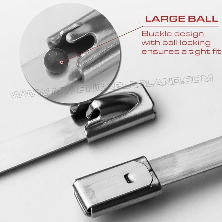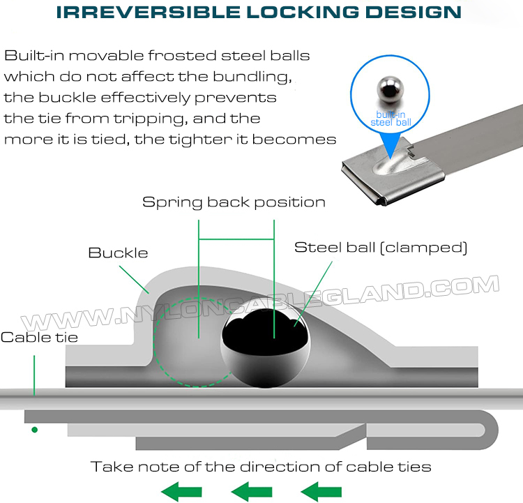 (2) Unwiderrufliche Verriegelung – Ausgestattet mit einer selbstsichernden Schnalle und einem Kugelverschlussmechanismus, ist der Kabelbinder robust, langlebig, einfach zu bedienen und verhindert ein unbeabsichtigtes Lösen nach der Installation.