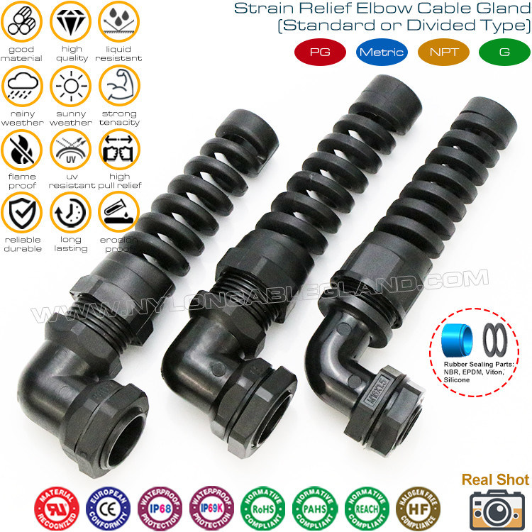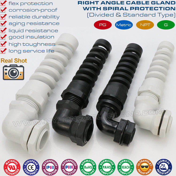 | Produktbezeichnung: | PG & metrische IP68-Nylon-Kunststoff-Winkelkabelverschraubungen (rechtwinklig) mit spiralförmigem, flexiblem Schutz |