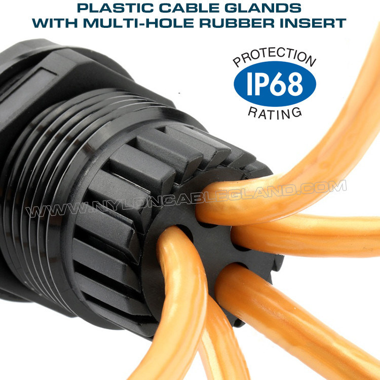 Nylon-Kabelverschraubungen mit Mehrloch-Dichtungseinsatz für mehrere Kabel durch die gleiche Öffnung und ideal für Klemmsysteme. Die Mehrloch-Kabelverschraubungen (Mehrfacheinführung) IP68 aus Kunststoff mit PG- oder metrischem Gewinde für Elektrogehäuse sind zum Schutz Ihrer elektrischen Geräte konzipiert die in den Gehegen untergebracht sind. Es ist für jede Einheit mit einem Kabelzugentlastungseinsatz mit mehreren Löchern ausgestattet, sodass Sie mehrere Kabel hindurchführen können, um sie an die Anschlüsse verschiedener elektrischer Geräte anzuschließen. Die wasserdichte IP68-Kabelverschraubung bietet in Kombination mit wasserdichten Steckern einen zuverlässigen Schutz vor Wasser und Staub, sodass Ihr elektrisches Gerät einen umfassenden Schutz erhält, insbesondere wenn Sie die Geräte nach der Installation in den Gehäusen längere Zeit nicht konfigurieren müssen. Eine einfache und schnelle Montage am Anschluss trägt dazu bei, die Möglichkeit eines Geräteaustauschs aufgrund von Problemen wie eindringendem Wasser zu verringern.